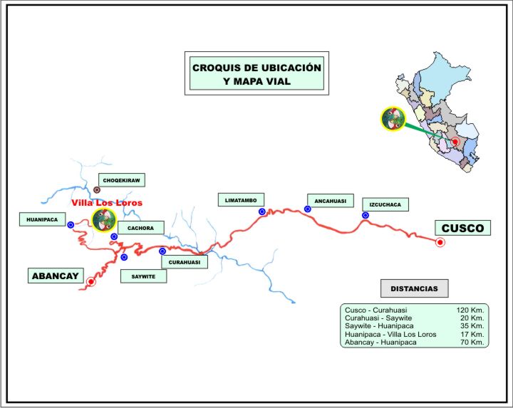 Villa Los Loros lodge se encuentra a 17,500 kms. del pueblo de Huanipaca, recorriendo la carretera afirmada Huanipaca-El Carmen, que se dirige hacia el cañón del Río Apurímac. Puedes también alcanzarnos a pie, llegando del área de camping de Choquequirao.)